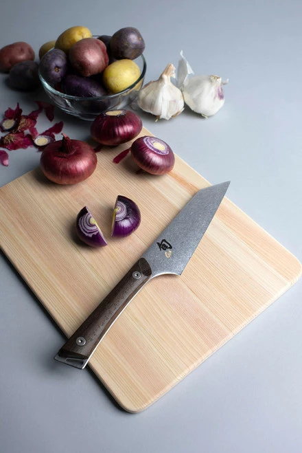 The Shun Kanso Asian Multi-Prep Knife is a Japanese-style boning knife. The 5-in. blade with its triangular shape is perfect for maneuvering around bones and between joints. Its razor-sharp, 16° cutting edge makes removing breasts from bone easy and it cuts joint cartilage almost like butter. Yet this knife does even more. It’s also ideal as a utility knife for trimming, slicing, and dicing a full range of fruits and vegetables.