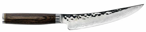 The Shun Premier 6″ Boning/Fillet Knife (TDM0774) is part of the beautiful Shun Premier line, which calls to mind the hand-forged knives of ancient Japan. While each knife still takes at least 100 handcrafted steps to complete, the materials Shun uses are among the most advanced in the industry. Each blade has a cutting core of Shun’s proprietary VG-MAX “super steel” to take and hold a precision edge. The layered Damascus cladding supports the core and provides additional stain resistance. Near the edge of the blade, where the steels meet, an undulating line is formed—similar to the hamon formed when samurai swords are tempered using a traditional clay-baking technique. The hammered tsuchime finish acts like a series of hollow-ground cavities to reduce drag. The handles nestle comfortably in the hand, while the embossed end cap adds balance and beauty.
