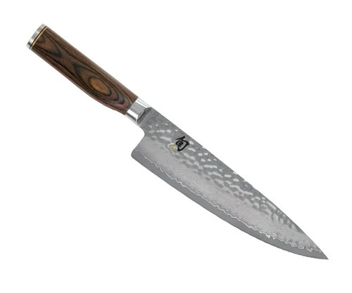 The Shun Premier 8-Inch Chef’s Knife is part of the beautiful Shun Premier line, which calls to mind the hand-forged knives of ancient Japan. While each knife still takes at least 100 handcrafted steps to complete, the materials Shun uses are among the most advanced in the industry. Each blade has a cutting core of Shun’s proprietary VG-MAX “super steel” to take and hold a precision edge. The layered Damascus cladding supports the core and provides additional stain resistance. Near the edge of the blade, where the steels meet, an undulating line is formed—similar to the hamon formed when samurai swords are tempered using a traditional clay-baking technique. The hammered tsuchime finish acts like a series of hollow-ground cavities to reduce drag. The handles nestle comfortably in the hand, while the embossed end cap adds balance and beauty.