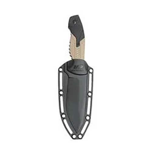 The Smith & Wesson M&P Striker fixed blade is great for your camping or tactical cutting needs. It is made from black finished stainless-steel and features a partially serrated tanto fixed blade and a black and tan aluminum handle. Includes black plastic belt sheath.
