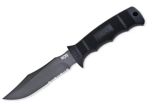 Like its big brother, SOG’s SEAL Pup has a partially serrated blade that is powder coated for low-reflection and corrosion resistance. Its lightweight, glass-reinforced nylon (GRN) handle features a raised diamond pattern for secure gripping in inclement weather. And like the SEAL Knife, it carries conveniently in a multi-mounting tactical kydex sheath.