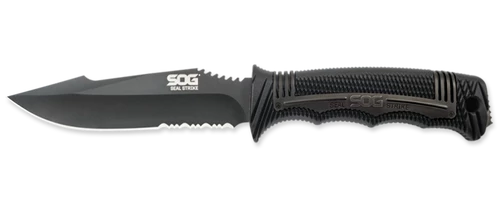 The newest member of the SEAL fixed-blade knife family, the SEAL Strike takes everything SOG has learned from years of real-world deployment and combines it into one spectacular package. This quality AUS-8 stainless steel, partially serrated blade is an excellent field companion for outdoor and underwater adventures. The SEAL Strike is serious business and carries on the tradition of supplying the world’s elite military forces. It comes with a standard hard nylon sheath or a deluxe model with built-in cord cutter, single-stage sharpener, firestarter, and larger attachment points. Be at the ready with the fully capable SEAL Strike.