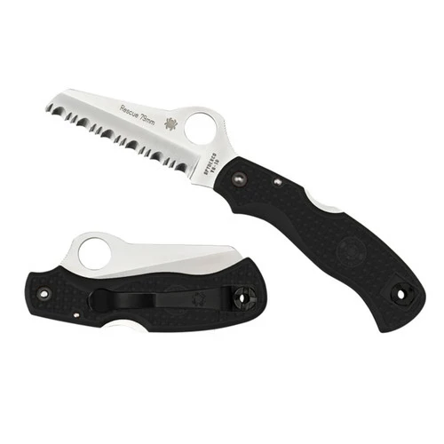 A smaller equivalent of the C14 93mm Rescue, it too has a flat saber-ground, SpyderEdge, VG-10 blade that ends in a sheepfoot safety tip. For smoother thumb rotation we enlarged the Spyderco Trademark Round Hole, which in turn creates a prominent hump to position the thumb on while cutting. The black FRN waffle textured handle has an ambidextrous, tip-up pocket clip.