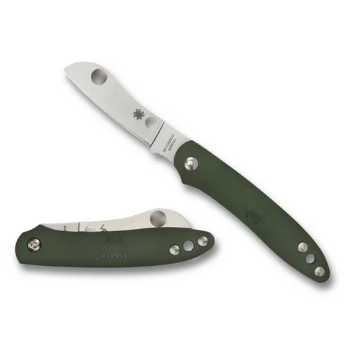 Unlike a traditional slipjoint, the Roadie’s blade is held open by an improved notched-joint mechanism. Its spring also forms the handle’s full-length back strap, giving it structural strength and providing a foundation for the durable fiberglass-reinforced-nylon (FRN) scales. The injection-molded scales are contoured for comfort and feature a recessed Spyderco “bug” logo on both sides.