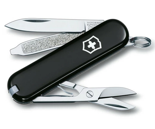 The Victorinox Classic Black (53003) is strong and sleek, this classic SD black acrylic pocket knife by Swiss Army always meets the challenge. Crafted in stainless steel and featuring a blade, nail file with nail cleaner, scissors, key ring, tweezers and toothpick. Lifetime guarantee against any defects in material and workmanship. Approximate length: 2-1/4 inches This classic multi-tool is also available in .Â