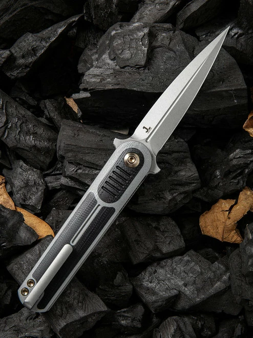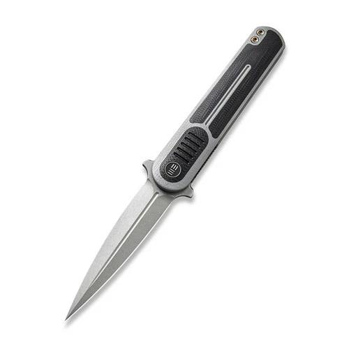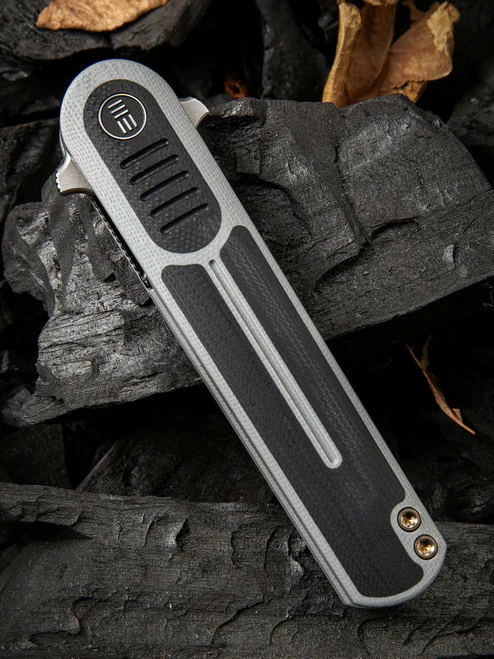 The Angst is an impressive yet compact flipper from Justin Lundquist and WE Knives that makes a statement! It has the distinct tactical look but the manageable size of a seven-inch utility folder. The completely symmetrical design is slick and stylish with the dual G10 inlays that offer function as well as fashion. The cross guard flipper offers smooth action on the caged ceramic ball bearings. The forward inlays, with their milled pattern, are where you should be placing your fingers during use with a solid, no-slip pinch grip. You can also use it in a traditional saber/hammer grip and utilize the finger guards or you can use it pointer finger out for maximum control. It features a nested liner lock, G10 backpacker, right-hand, tip-up titanium pocket clip, and a superb weight to blade length ratio.Â