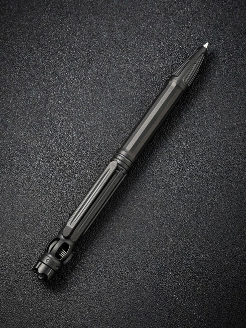 The Baculus is a tasteful titanium bolt-action ballpoint pen from WE Knife Co with a machined design including a comfortable embellished grip for your fingers while writing. The bolt action is used for extending and retracting the black ink cartridge and is more fun to use than a standard pen clicker. If you love to fidget, this pen features a fidget spinner on top that can deliver hours of busywork for your fingers. The ball end also doubles as a glass breaker. Â