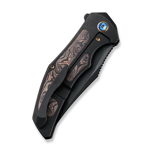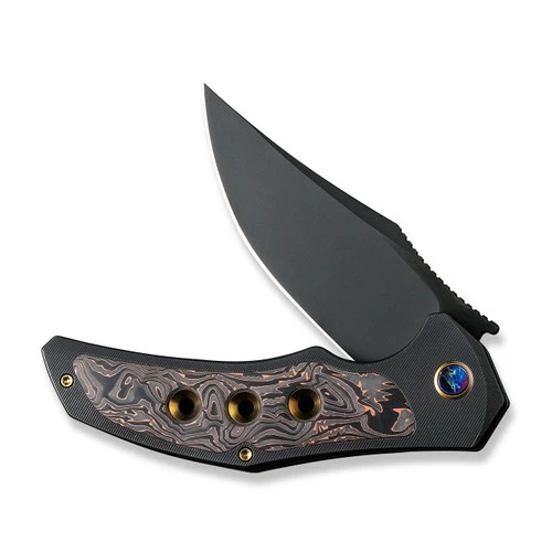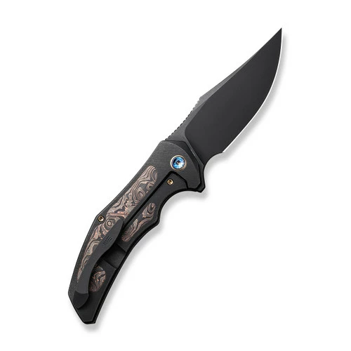 This model features a black stonewashed CPM 20CV blade and a black titanium handle with copper foil carbon fiber inlays.Â