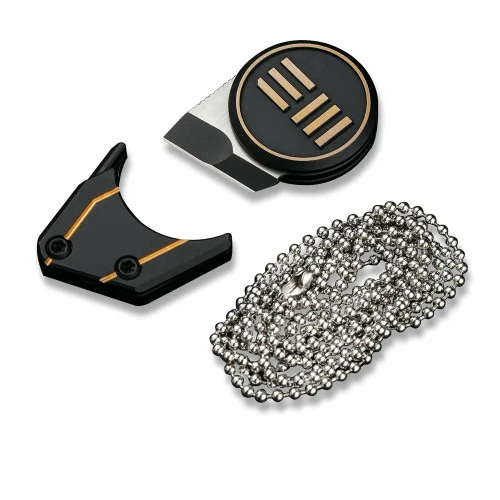 This model of the Quark has a two-tone Bohler M390 blade, black and gold 6Al4V titanium handle, and a magnetic 6Al4V titanium sheath with a stainless steel chain.