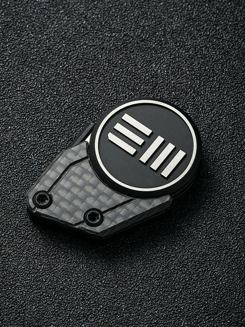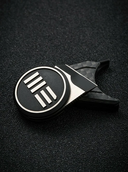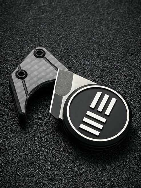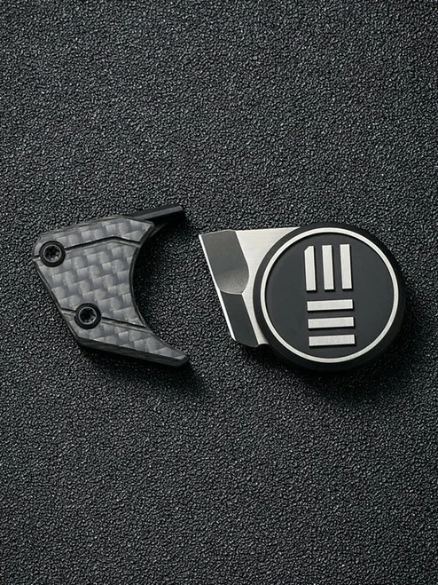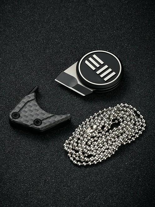 This model of the Quark has a two-tone Bohler M390 blade, black and silver 6Al4V titanium handle, and a magnetic 6Al4V titanium and carbon fiber sheath with a stainless steel chain.
