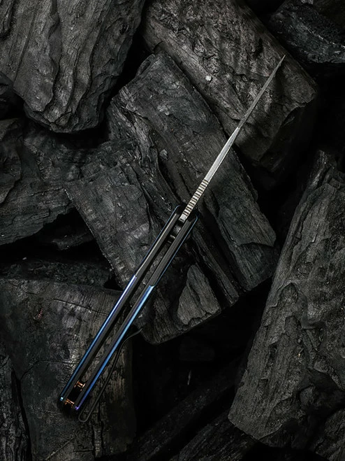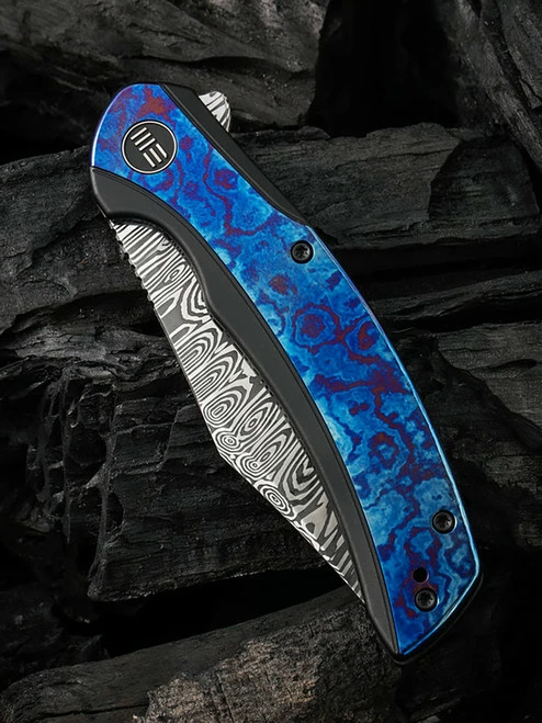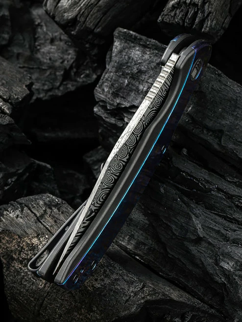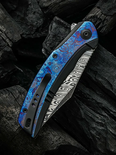 With an eye-catching clip point blade of Damasteel, the WE Knife Co. Snick flipper features a tough frame lock and great opening action due to the flipper tab with a ball-bearing pivot. The handle of this knife features a titanium frame with an insert scale of Timascus on either side adding an extra design detail. The Snick has a deep-carry right side pocket clip and comes with a second pocket clip for those looking for left side carry.Â