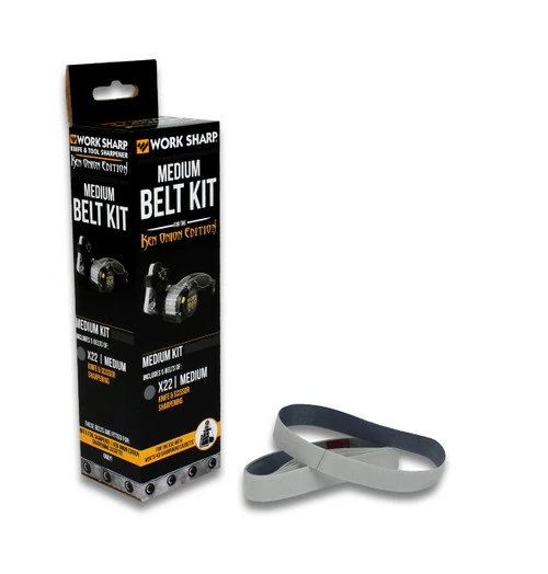Contains five Ken Onion X22 Coarse Abrasive Belts for the Ken Onion Knife and Tool Sharpener, and the Ken Onion Tool Grinding Attachment. Intended for general sharpening of knives. Not compatible with other Work Sharp Tools.