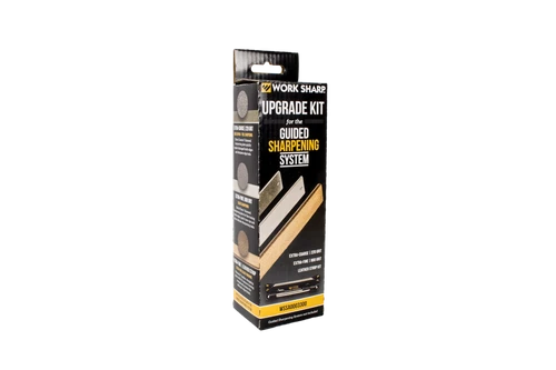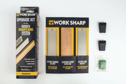The Guided Sharpening System Upgrade Kit includes two additional Diamond Plates (Extra Coarse 220 grit and Extra Fine 800 grit), and a Leather Strop Kit with 25° angle guides and 0.5 micron chromium oxide honing compound. The Diamond Plates and Leather Strop are 6” x 1.25” and are designed to fit the Guided Sharpening System.