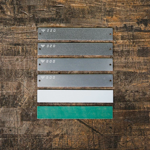 - Includes seven (7) abrasive grits: 220, 320, 400, 600, and 800 diamond, Fine Ceramic, Leather Strop