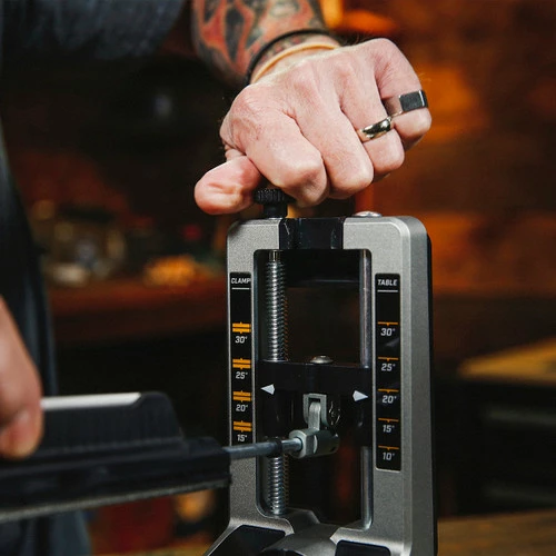 The included small knife table attachment mounts to the sharpener base so you can use the same abrasives and angle indicator for consistent results. The attachment allows you to sharpen small pen knives down to a 15° angle. Magnets and indicator marks on the table help to secure the knife and ensure repeatable placement when switching from one side of the knife to the other. The reusable packaging provides space to keep your abrasives and attachments organized and ready for use. Includes a 3 Year Warranty.