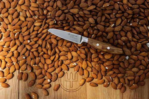 The Wusthof Amici Paring Knife is the perfect tool for small, precise cuts, like finely slicing a clove of garlic, peeling potatoes, or coring apples for pie. The short, precision-sharpened blade makes intricate chopping and maneuvering a simple, accurate process, and a full bolster, the thicker area between the blade and the handle on forged knives, offers added protection for your fingers. The custom-grained Calabrian olive wood handle is naturally water-resistant and antibacterial, and its organic shape fits comfortably in hands of any size.