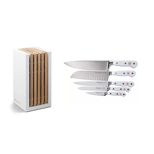 The Classic White Designer Block features a unique design with an integrated 5-slot compartment made of oiled ash wood for a block that is both functional and elegant. Thanks to the open design, knives can easily be inserted or removed and blades of different sizes can be combined and stored safely. The frame is made from white lacquered beech for a colour contrast that enhances contemporary kitchens and complements Scandinavian inspired design.